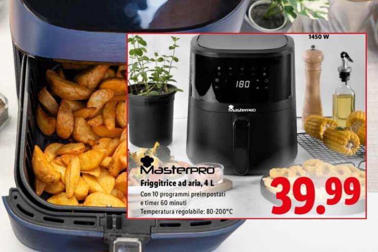 LIDL sfida gli sconti di Amazon Prime Day proponendo in sconto uno degli elettrodomestici più amati degli ultimi anni: la friggitrice ad aria. In particolar modo, la nota catena tedesca ha masso in vendita la friggitrice ad aria Masterpro da 4 litri, disponibile a soli 39,99 €. Con 10 programmi preimpostati, timer da 60 minuti e temperatura regolabile da 80 a 200 °C, questo modello unisce efficienza e semplicità d’uso. Il suo motore da 1450 W garantisce una cottura uniforme grazie a un potente flusso d’aria calda che cuoce gli alimenti senza bisogno di olio in eccesso.