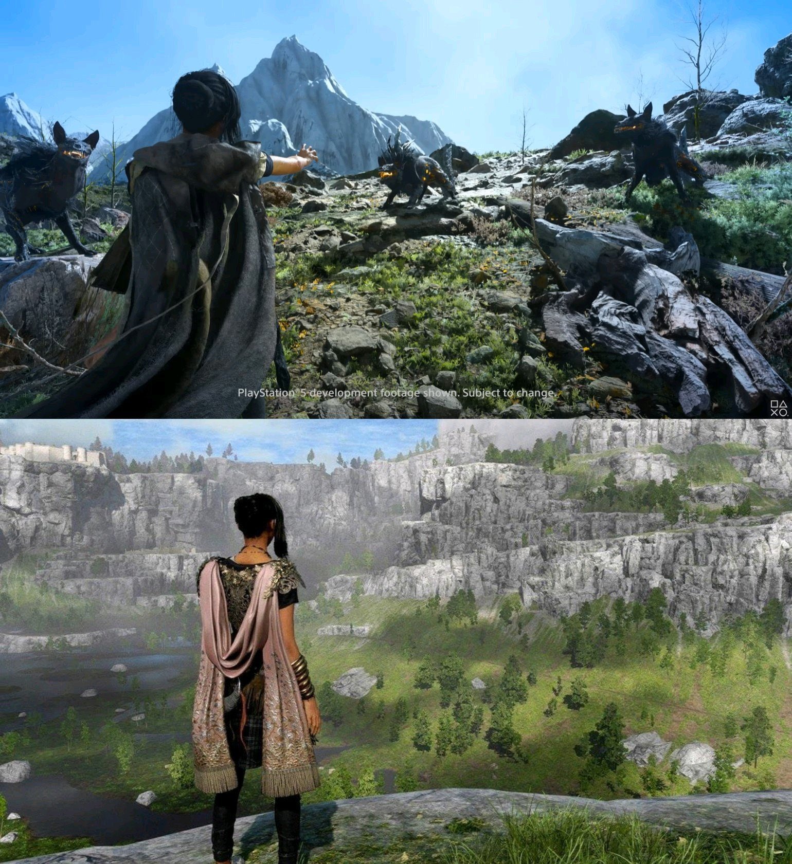 Controllando queste foto comparative è possibile costatare un considerevole calo nella quantità degli elementi presenti a schermo, in particolar modo degli alberi posti sullo sfondo in lontananza, il tutto presentando delle texture del terreno e delle rocce caratterizzate da una qualità decisamente inferiore a quelle inserite nel filmato pubblicato da Square Enix ormai un paio di anni fa.