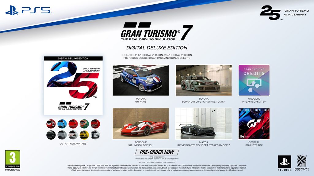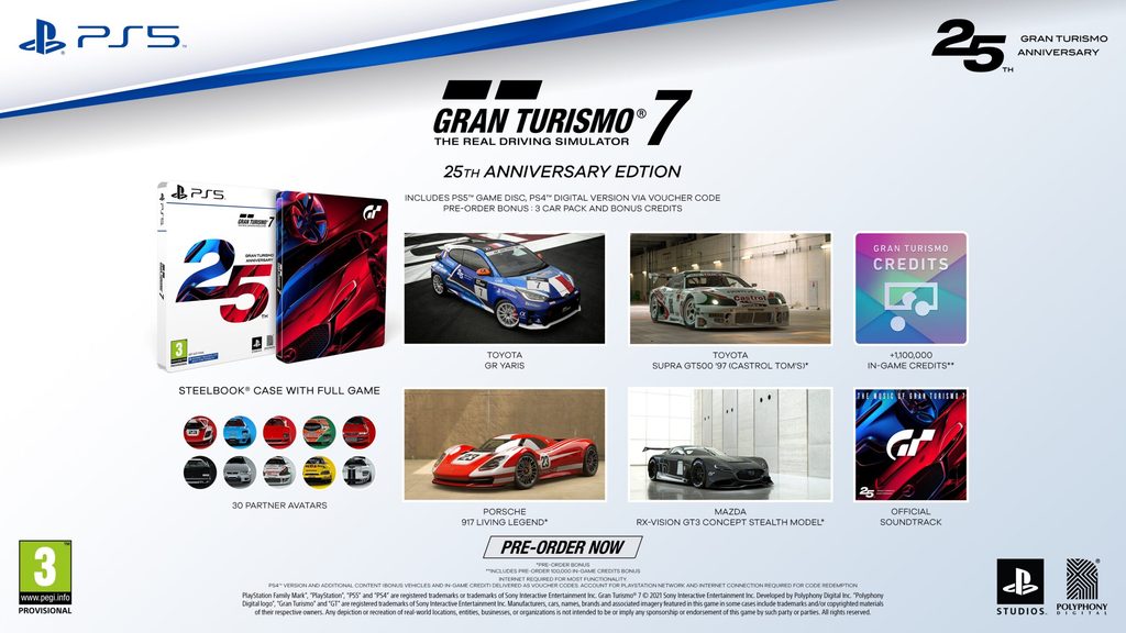 Partiamo proprio dai bonus preordini, con i fan della serie che potranno mettere le mani su una Toyota Castrol TOM’S Supra, su una Mazda RX-VISION GT3 Concept (Stealth), una Porsche 917 Living Legend ed infine su 100.000 crediti di gioco (CR) prenotando il nuovo capitolo della serie presso un rivenditore aderente oppure sul PlayStation Store.