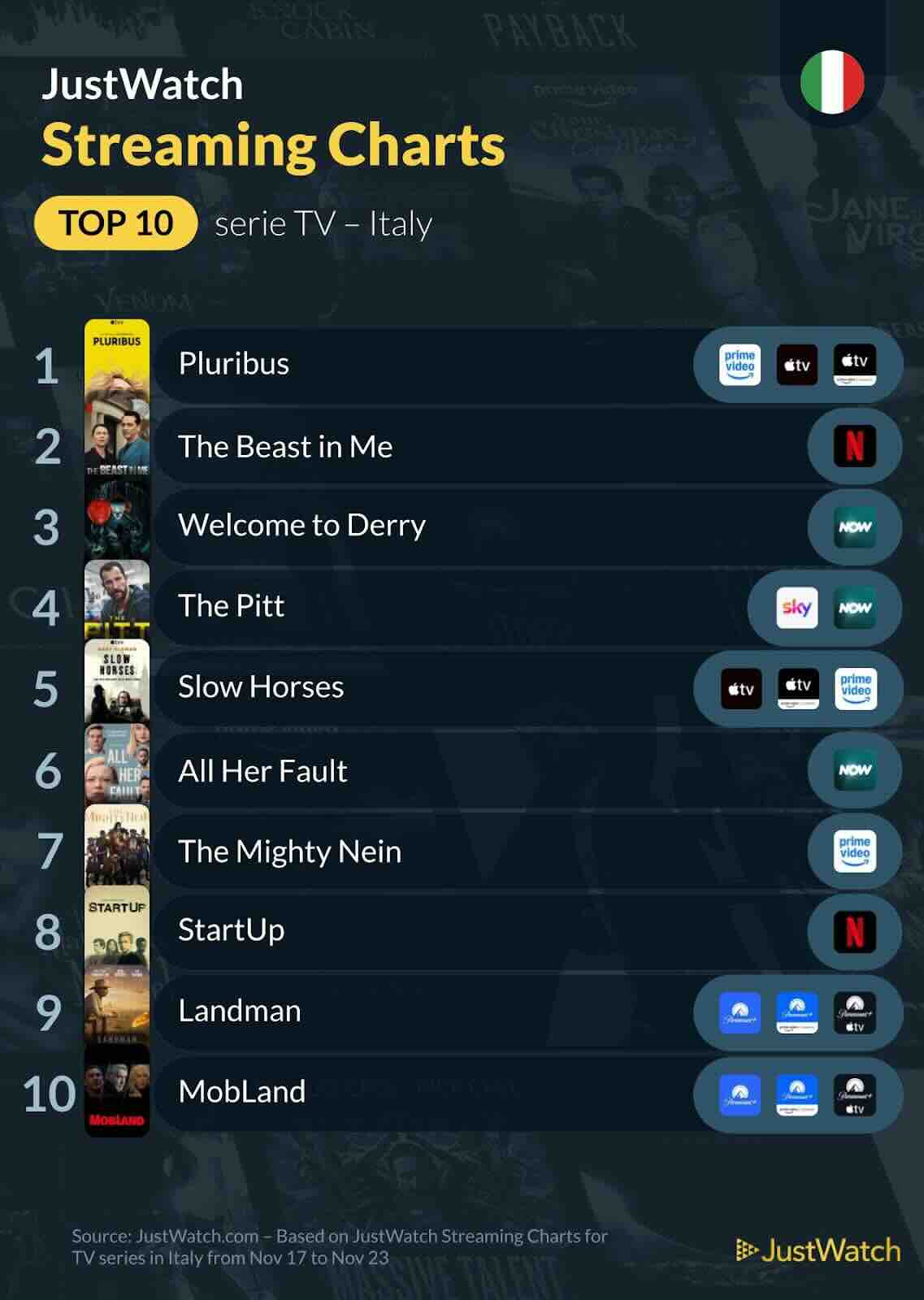 JustWatch, la più grande guida al mondo di contenuti in streaming in grado di aggregare in un unico posto film, serie TV ed eventi sportivi da centinaia di piattaforme di streaming in tutto il mondo, ha svelato i film e le serie TV più visti la scorsa settimana in Italia, dove al primo posto troviamo Now You See Me – I maghi del crimine e Pluribus.