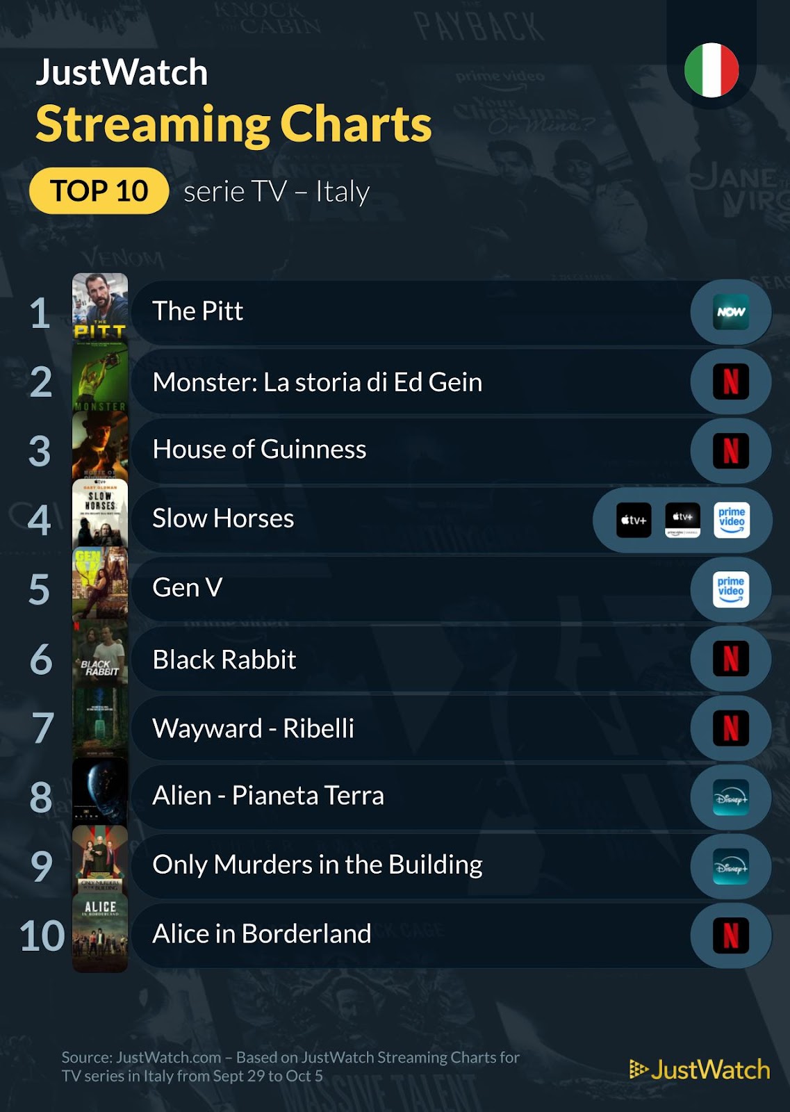 JustWatch, la più grande guida al mondo di contenuti in streaming in grado di aggregare in un unico posto film, serie TV ed eventi sportivi da centinaia di piattaforme di streaming in tutto il mondo, ha condiviso l’ultima classifica inerente a top film e serie TV più gettonate in Italia nell’ultima settimana, ad inizio Ottobre 2025.