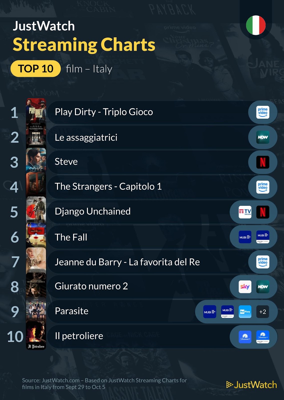 Per i film, questa settimana entra direttamente in vetta Play Dirty – Triplo Gioco. La pellicola segue Parker, ladro professionista, alle prese con il colpo della vita: una sfida mai affrontata prima, in cui lui e il suo team dovranno affrontare un dittatore sudamericano, la mafia di New York e l’uomo più ricco del mondo.