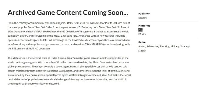 “Sfortunatamente è stato solo un typo di uno dei nostri sviluppatori web e non un leak o una indicazione che MGS HD Collection stia per arrivare su PS4. O che Armature stia lavorando a un nuovo titolo di MGS“.