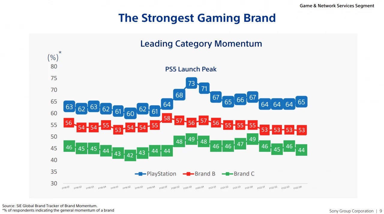 In poche parole questa diapositiva dice che PlayStation ha una tendenza superiore a “Brand B” (Nintendo) e “Brand C” (Xbox), in termini di “slancio generale”. È suddiviso per “% di intervistati” negli ultimi cinque anni circa.