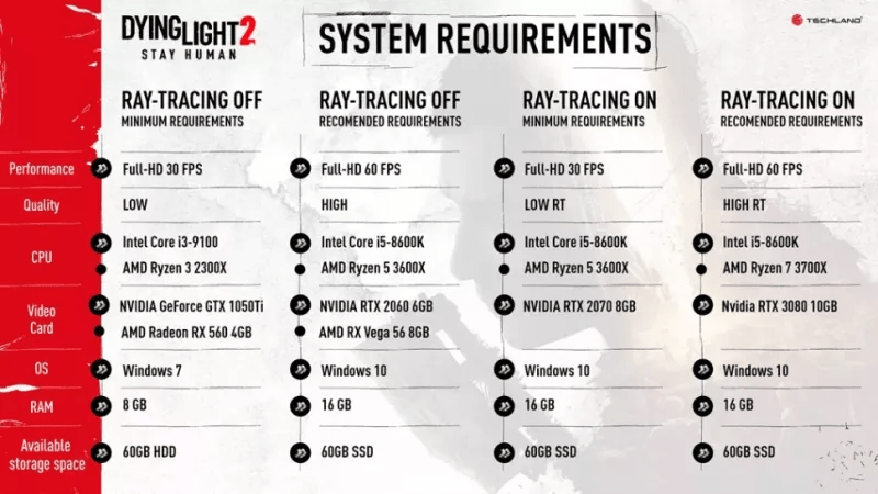 Il team dietro all’attesissimo Dying Light 2, Techland, ha condiviso i requisiti di sistema, minimi e raccomandati, per giocare l’atteso titolo a base di parkour e zombie sul proprio PC. Vi sono requisiti minimi e raccomandati per il gioco con il ray tracing spento, e minimi e raccomandati per il gioco con il ray tracing attivo – questi ultimi sono requisiti molto esigenti.