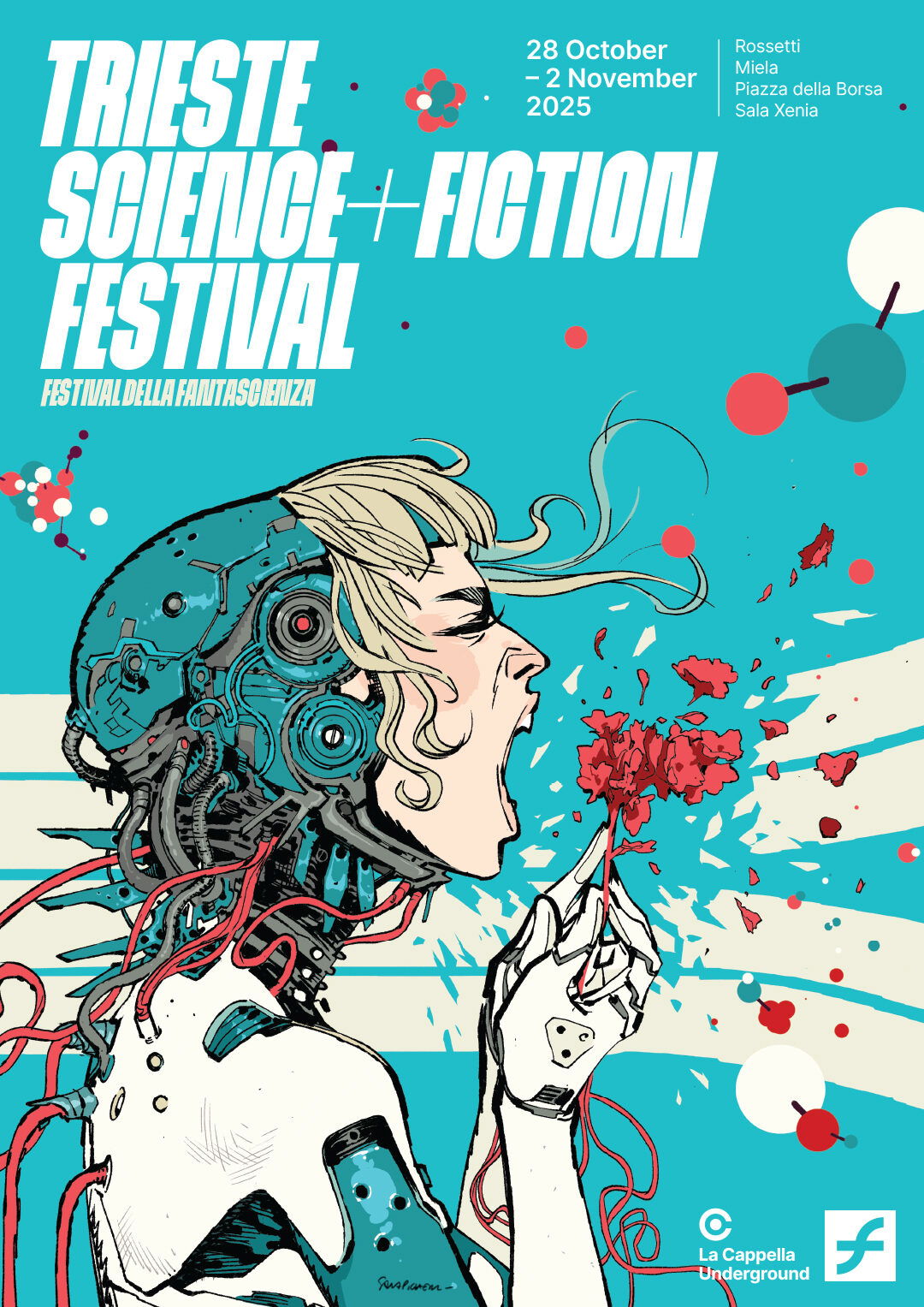 Il poster del Trieste Science+Fiction Festival 2025 è un potente manifesto visivo che rende omaggio al potere immaginifico dell’essere umano. Al centro, una figura femminile il cui volto comunica rabbia e vulnerabilità. Il fiore stretto tra le mani rappresenta un gesto di resistenza e delicatezza, emblema di un’umanità che, seppur ferita, rifiuta la disumanizzazione. L’opera è un grido di autenticità in un’epoca di intelligenze artificiali e identità liquide: un invito sincero a non cedere alla spersonalizzazione, a riscoprire la voce umana come ultimo baluardo di immaginazione e resistenza.