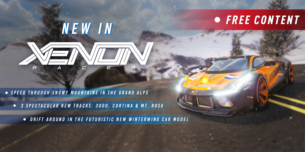 Rotterdam, The Netherlands – May 17, 2019 – Un aggiornamento di contenuti completamente gratuito arriva a spron battuto su Xenon Racer, con una nuova località innevata e un nuovo team. Questo aggiornamento è il primo di una serie di tre: a giugno verranno aggiunte diverse nuove personalizzazioni, come cerchioni e livree, e a luglio arriverà una ulteriore località con molteplici tracciati e una nuova vettura. In aggiunta a tutti questi miglioramenti gratuiti la versione per Nintendo Switch è stata da poco aggiornata per includere la modalità performance e la modalità qualità, che affiancano tutta una serie di perfezionamenti atti ad ottenere miglior stabilità.